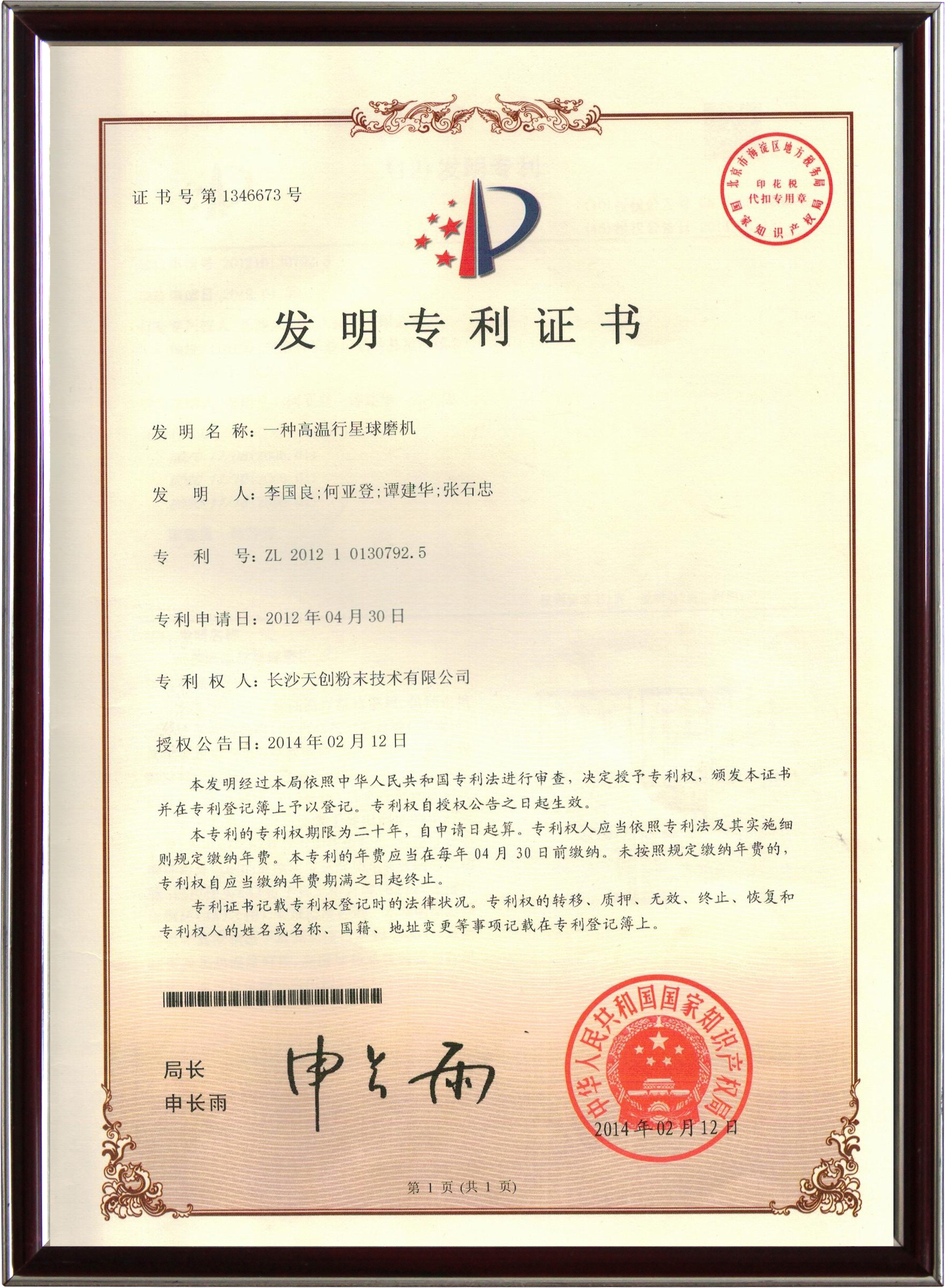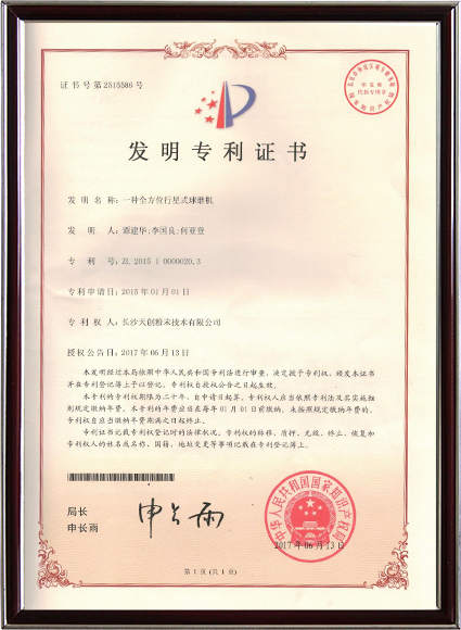 長沙天創粉末技術有限公司擁有多項發明專利證書、商標注冊證、ISO9001質量管理體系認證證書、歐盟CE認證書等。