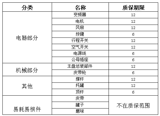 1.設備除易耗件、易碎件配件(如皮帶、齒輪、球磨罐、磨球、密封圈等),其它任何產品質量問題都在一年質保范圍。