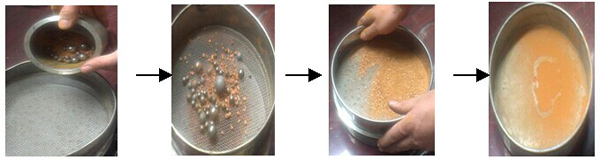①倒磨球、物料  ②分離磨球、物料   ③分離物料      ④取出物料